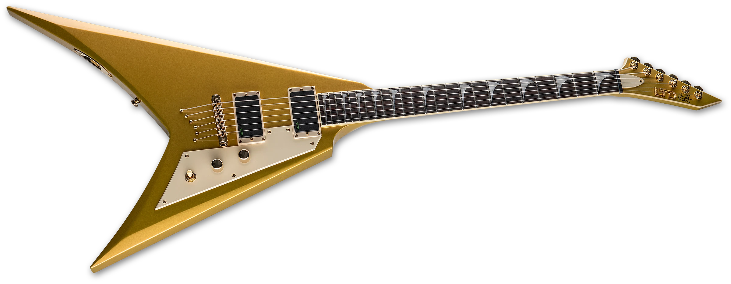 La ESP LTD KH-V Metallic Gold (LKHVMG) es el más reciente y contundente modelo de la línea Signature de Kirk Hammett, guitarrista líder de Metallica y referente absoluto del metal por más de cuatro décadas. Esta guitarra está construida para ofrecer una experiencia profesional sin concesiones, con una apariencia imponente y un tono demoledor.